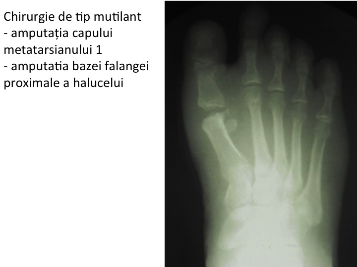 - amputatia bazei falangei proximale (procedeu Keller) determina retractia sesamoidelor si metatarsalgie M1, precum si scurtarea halucelui, care devine balant (lipsit de control si de stabilitate);