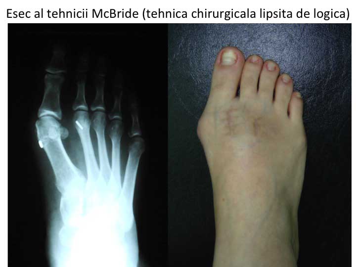 - esecul poate fi consecinta tehnicilor chirurgicale lipsite de logica (operatia McBride), ce promit corectia deformatiei fara sectionarea primului metatarsian ;