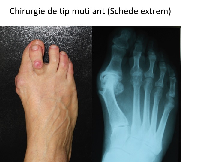 - tehnica de amputatie tip Schede inlatura o portiune de os sanatos ("exostoza"), mutiland inutil capul metatarsianului;