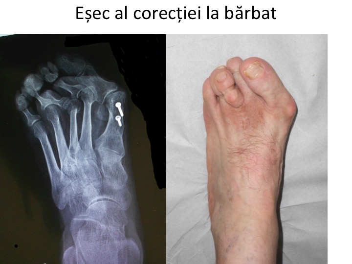 - erori de tehnica chirurgicala: scurtarea/ridicarea exagerata a capului primului metatarsian, anomalii rotationale ale acestuia;
