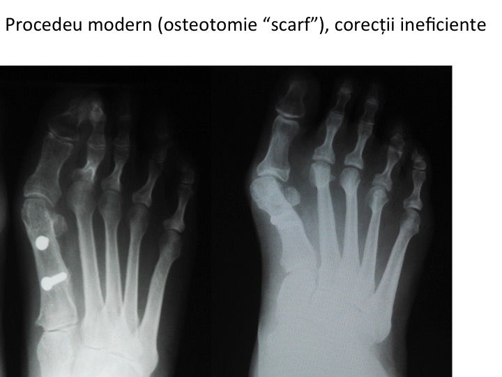 * ne-aplicarea principiilor moderne de chirurgie globala a ante-piciorului, ce presupun alinierea corecta a metatarsienelor ;